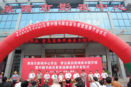 7月16日,我市隆重举行市影视中心开业、青岛莱西燕海美术馆开馆、中国书画名家首届邀请展开业仪式。山东省原人大常委会副主任时立军,市委书记王久军,市委副书记、市长孙利国,青岛市文联副主席谢志强,山东省美术家协会副主席、青岛市文联副主席、青岛国画院院长曾先国,北京华夏联合电影院线公司总经理邢占宇,市人大常委会主任逄增波,市委常委、宣传部长姜水清,市委常委、市委办公室主任王宝善,副市长王仁臣,市政协副主席柳杰,青岛博润置业有限公司董事长胡军基出席仪式并剪彩。来自全国各地的70多位知名书画家和市直各部门、各镇(办)负责人参加了仪式。
