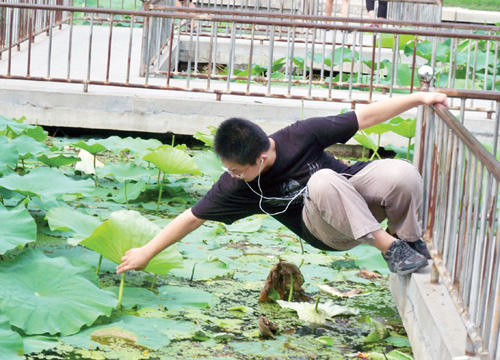 夏日炎炎,到公园纳凉消暑的人增多,但一些不文明行为却大煞眼前风景。有市民反映,公园内随地小便、乱扔垃圾等不文明行为着实不少,还出现了不少摧残花朵的“采花大盗”和攀爬假山的“猴子”。荷花是夏季月湖公园的一大特色,远看颇有“四面荷花三面柳”的意境,但是走近了观察就会发现这里的荷花遭到相当严重的“摧残”,靠近栏杆处的甚至连荷叶都惨遭“毒手”。不远处还有孩子攀爬假山嬉戏,实在太危险!