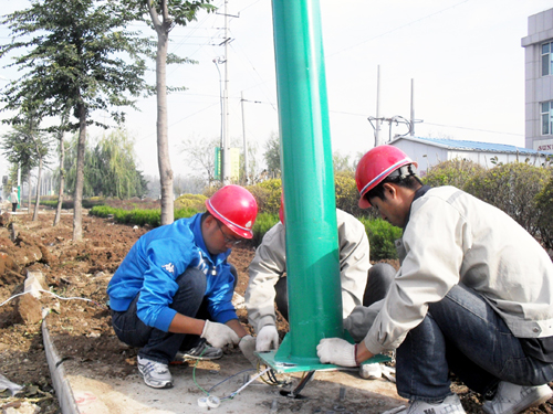 近日,市城建亮化部门组织人力、机械,加班加点,全力以赴靠在香港北路路灯工程施工现场。拉线、灯具安装、灯杆安装,有条不紊地推进。仅用两天时间,就提前完成了香港北路所有路灯安装,共安装双侧路灯108基,解决了周边居民夜间出行的照明问题。图为施工人员正在安装路灯。 (郭永波)