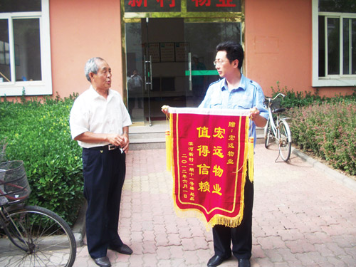 日前,宏远滨河新村保安人员在小区巡逻时发现一车库门上有一套钥匙,在确定住户不在场的情况下,该保安人员将钥匙带回物业办公室,并及时查找住户电话,通过联系将钥匙归还给业主,保证了业主的财产安全。图为业主向物业赠送锦旗表示谢意。
