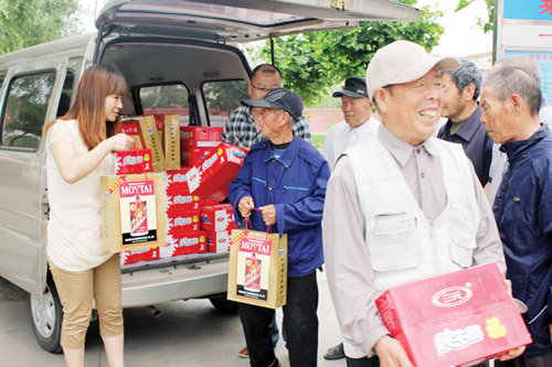 6月17日,我市国酒茅台专卖店经理左晓梅带着价值2000多元的茅台干红和牛奶来到市老年公寓,看望那里代养的60多名老人,祝老人们父亲节快乐。