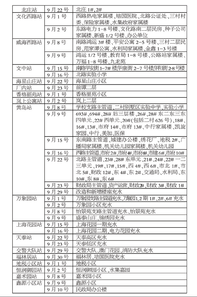 此次充水时间从9月1日开始,到10月6日全部结束,各小区的充水时间用户可查阅《金莱热电2012-2013年度供热季换热站充水计划》(见附表),用户可按表格的时间安排进行准备。金莱热电提醒市民,充水期间,家中最好留人,一旦发现暖气漏水,首先控制水的蔓延,如关闭阀门、用器皿接水等,并立即打电话与所属换热站联系,详细报出所在地址、联系电话及故障现象,便于金莱热电能备足抢修工具和必要的抢修人员。