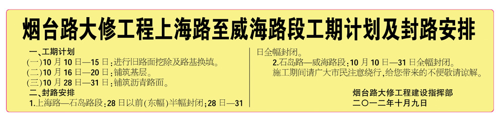 烟台路大修工程上海路至威海路段工期计划及封路安排