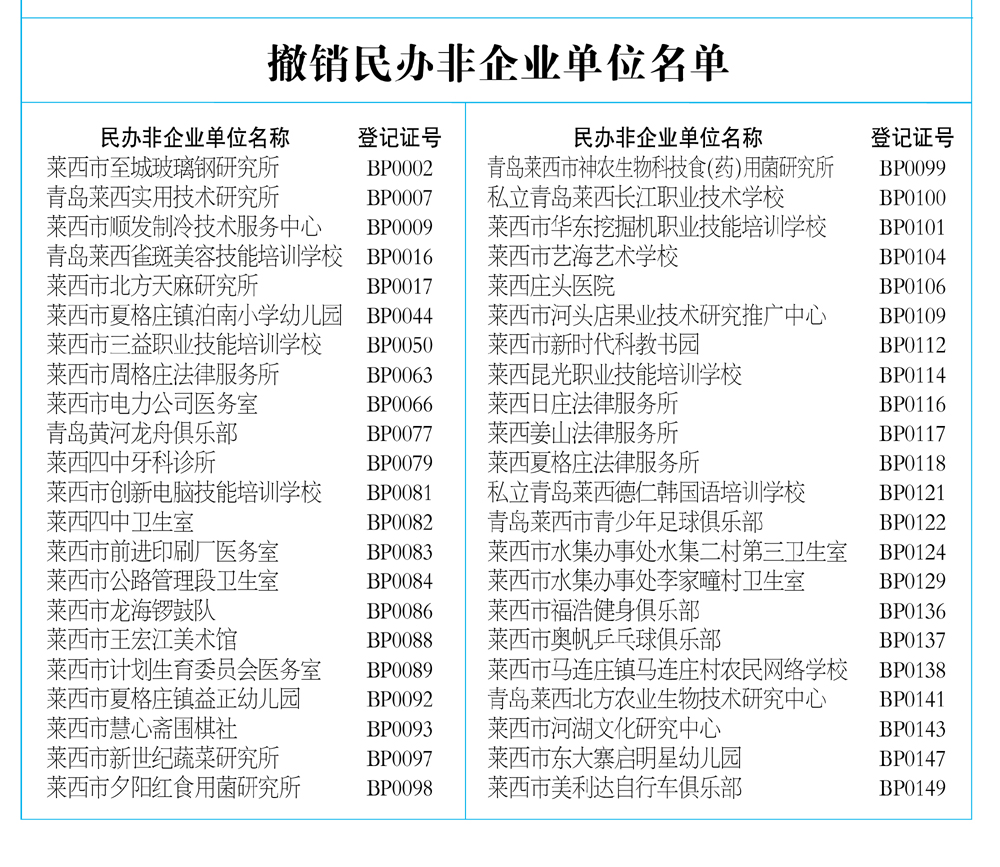 请莱西市至城玻璃钢研究所等43家民办非企业单位在业务主管单位和有关机关指导下,依法进行清算事宜,并于清算结束后15日内到登记管理机关依法办理注销登记。
