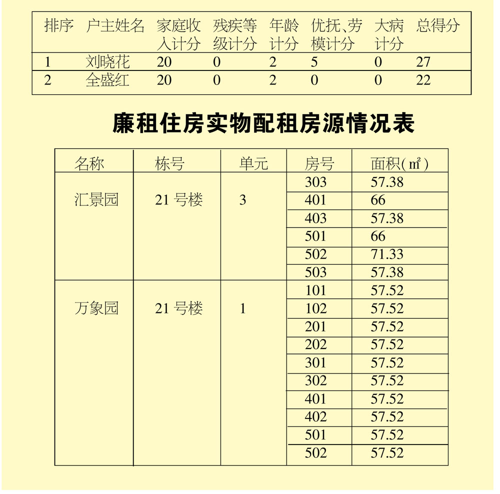 根据莱西市人民政府办公室《关于加强廉租住房保障实物配租管理工作的通知》等有关规定,经对符合条件的申请家庭逐一评分,现对综合排序情况进行公示,请广大市民进行监督。查询电话88400675;监督举报电话:莱西市民政局:88400675、莱西市监察局:88405221。