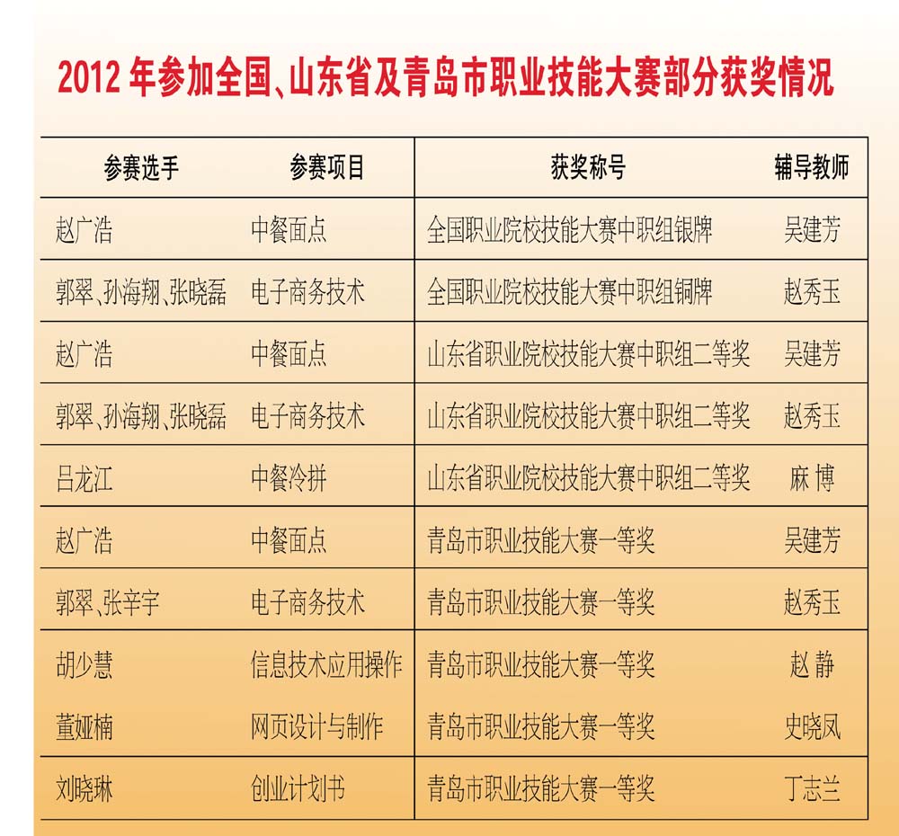 学校牢固树立争金夺银意识,提出“面向全体抓联赛,瞄准国赛抓强化”的口号,制定完善的技能教学计划,通过大赛引领学生、教师、专业、学校四位一体共同成长。2012年,参加各级技能大赛取得了历史性突破:获青岛市一等奖5个,二等奖6个,三等奖28个;获山东省二等奖3个;获全国二等奖1个,三等奖1个,学校被评为青岛市技能大赛组织先进单位。同时,狠抓对口高职升学。选拔优秀学生组建高职本科升学班,安排优秀教师辅导,2012年高职升学本科达线27人,居莱西市同类学校首位;学校重视职业资格证书考核与鉴定工作,毕业生双证率98%;学校大力推进精品课程建设,《网络管理》获得青岛市首批精品课程,《服装数学》被评为青岛市第二批精品课程。