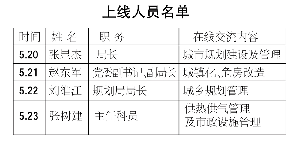 2013年5月20日—5月23日每天上午7:50—8:30,莱西市城建局部分领导做客莱西人民广播电台“政风行风在线”栏目,将围绕全市城市规划建设及管理、城镇化、危房改造、城乡规划管理、供热供气管理及市政设施管理等方面工作与听众进行在线交流,受理、答复群众投诉。