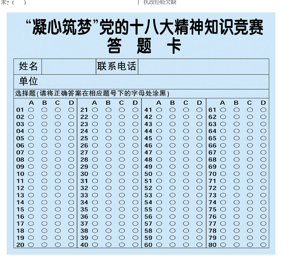 2、报送要求:所有参加答题人员答题卡由各参加单位统一收取并按要求投递至组织单位。竞赛组织单位不单独接收个人邮递的答题卡。6月18日前,各单位统一将答题卡送至市委宣传部教育科(地址:市行政办公中心0421房间,联系电话:88405309)。