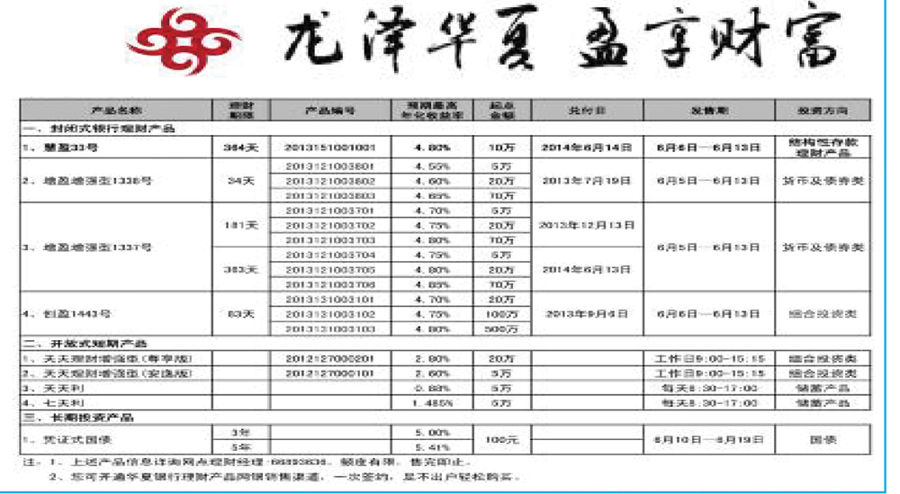 华夏银行提示您:利率不断下调,存款收益降低。为合理优化您个人的资产配置,可适当选择购买理财产品。华夏银行"龙盈"系列理财产品预期收益率全市同业最高,是您投资理财的最佳选择!