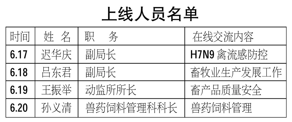 2013年6月17日—6月20日每天上午7:5 0—8:30,莱西市畜牧局部分领导做客莱西人民广播电台“政风行风在线”栏目,将围绕全市畜牧工作与听众进行在线交流,受理、答复群众投诉。