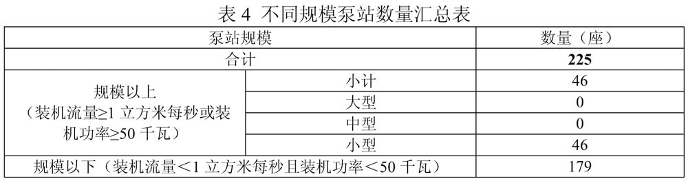泵站。共有泵站225座 (详见表4)。其中:在规模以上泵站中,已建泵站46座,在建泵站0座。