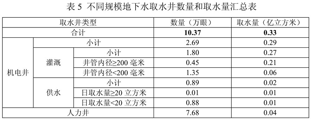 地下水取水井。共有地下水取水井10.37万眼,地下水取水量共0.33亿立方米(详见表5)。