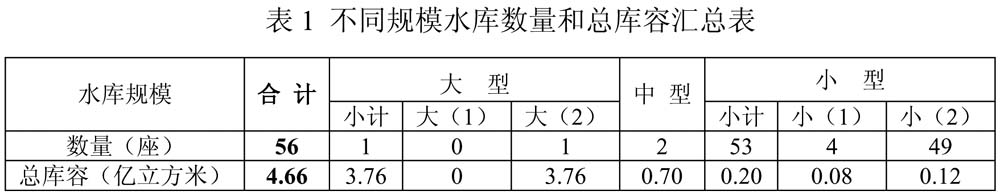 水库。共有水库56座,总库容4.66亿立方米(详见表1)。其中:已建水库56座,总库容4.66亿立方米。