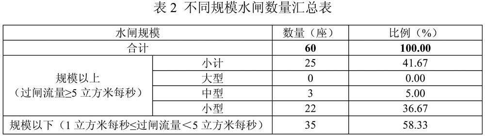水闸。过闸流量1立方米每秒及以上水闸60座,橡胶坝9座(详见表2)。其中:规模以上水闸中,已建水闸25座,在建水闸0座;分(泄)洪闸7座,引(进)水闸7座,节制闸11座,排(退)水闸0座,挡潮闸0座。