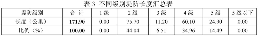 堤防。堤防总长度为171.90公里 (详见表3)。5级及以上堤防长度为171.90公里,其中:已建堤防长度为171.90公里,在建堤防长度为0.00公里。