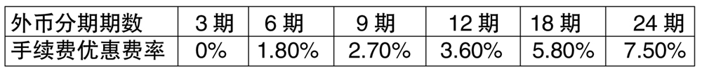惊喜六:境外消费,免费分期 中国银行信用卡客户境外单笔消费或账单满等值100美元,即可办理外币分期付款,3期免费,6期以上手续费半价优惠。各期费率标准如下: