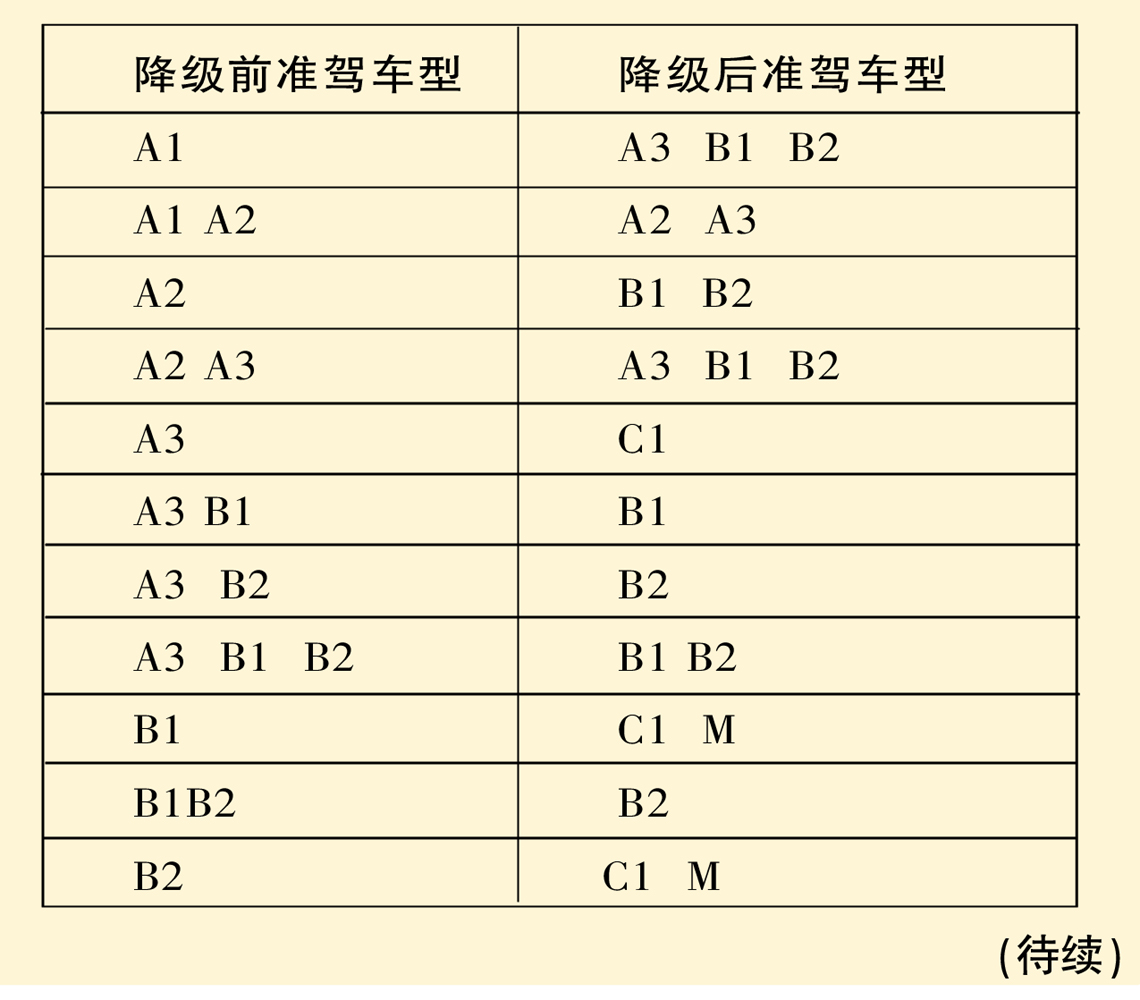 答:对于持有大型客车、牵引车、城市公交车、中型客车、大型货车驾驶证的,按规定要降级的,对照下表降级: