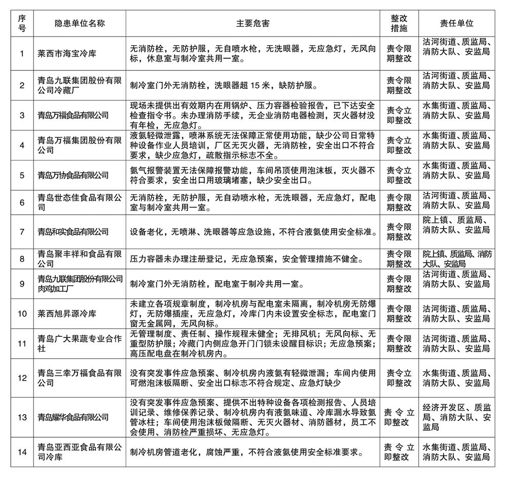 为深刻汲取中石化东黄输油管线“11·22”特别重大事故教训,我市在所有行业领域立即开展了安全生产大检查活动。截止到12月18日,共检查涉氨经营单位216家,发现安全隐患257条,按要求,现向社会公布第一批存在安全隐患的涉氨单位。下一步,我市将继续开展安全生产大检查活动,定期公布隐患情况,采取有力措施,依法严厉打击安全生产非法违法行为。