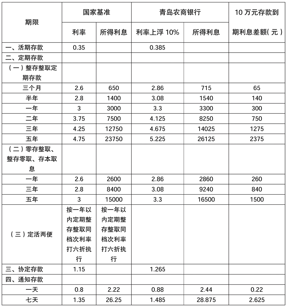 青岛农商银行存款利率全线上浮到顶