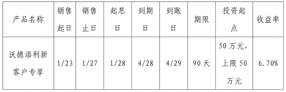 交通银行现发行“新客户专享产品”产品期限90天,预期收益率6.7%,产品单户销售金额50万元,销售时间为2014年1月23日到2014年1月27日。我行可为您进行产品预约,之后您就可以通过网银和手机银行进行购买,方便省心。