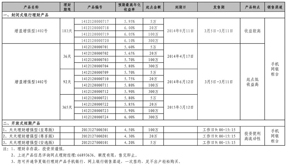 华夏银行提示您:利率不断下调,存款收益降低。为合理优化您个人的资产配置,可适当选择购买理财产品。华夏银行“龙盈”系列理财产品预期收益率全市同业最高,是您投资理财的最佳选择! 咨询电话: 66893636