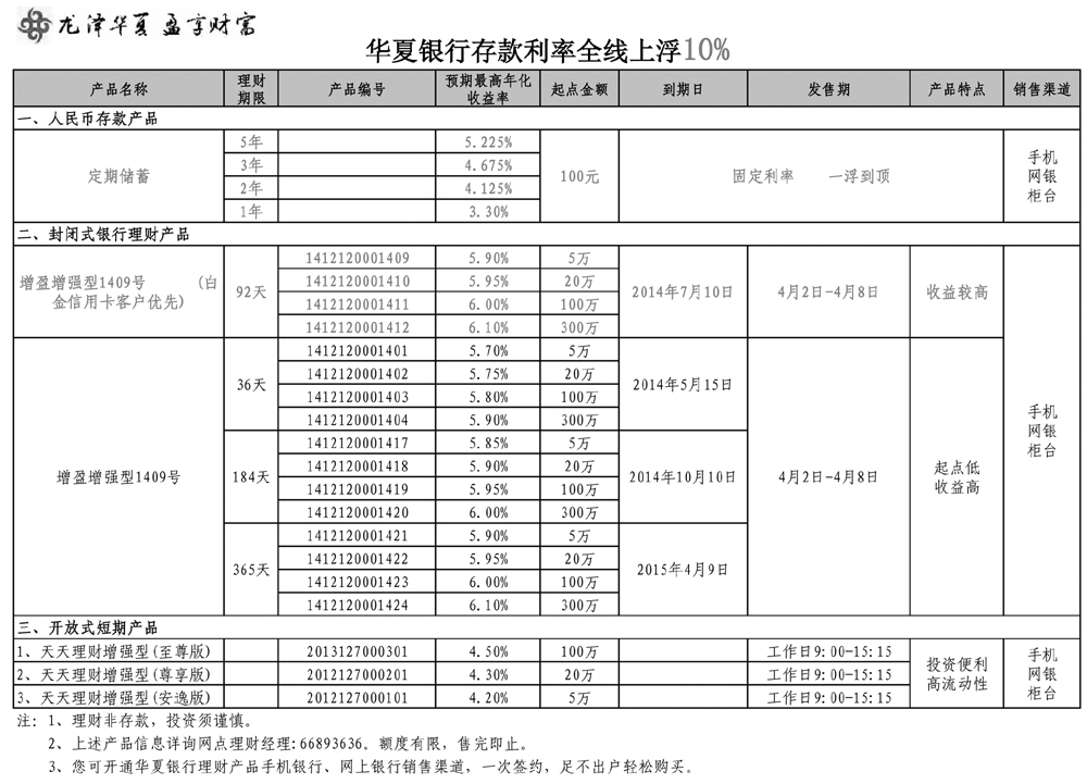 华夏银行提示您:利率不断下调,存款收益降低。为合理优化您个人的资产配置,可适当选择购买理财产品。华夏银行“龙盈”系列理财产品预期收益率全市同业最高,是您投资理财的最佳选择!