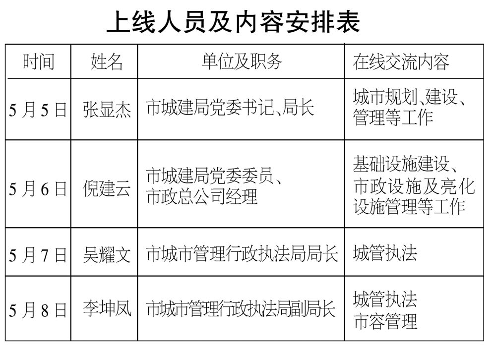 5月5日—5月8日城建与城市管理专题,每天上午8:50—9:30,分别有市城建局、城市管理行政执法局局长相关领导做客莱西人民广播电台“政风行风在线”栏目,与听众进行在线交流,受理、答复群众投诉。