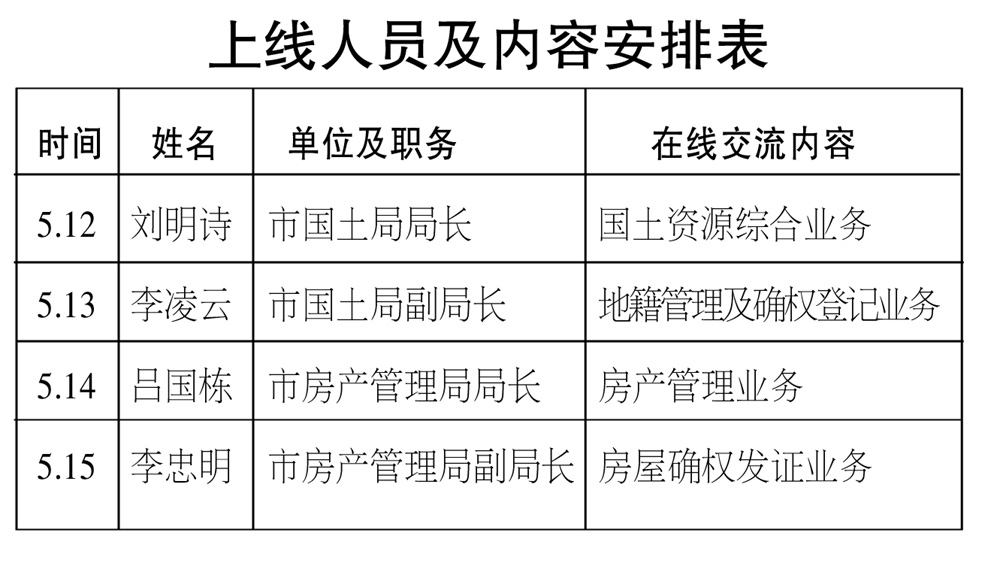 5月12日—5月15日国土资源管理与房产专题,每天上午8:50—9:30,市国土局、房管局局长等相关领导做客莱西人民广播电台“政风行风在线”栏目,与听众进行在线交流,受理、答复群众投诉。