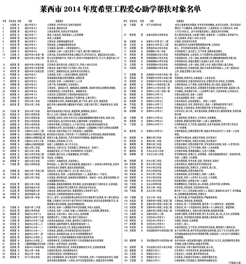 莱西市2014年度希望工程爱心助学帮扶对象名单