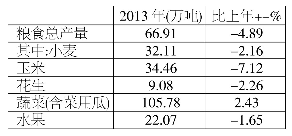 全市种植业增加值完成29.33亿元,比上年增长2.23%。粮食播种面积145.23万亩,比上年减少1.83%。总产量66.91万吨,比上年减少4.89%,亩产460.7公斤。花生总产量9.08万吨,比上年减少2.26%,亩产311公斤。