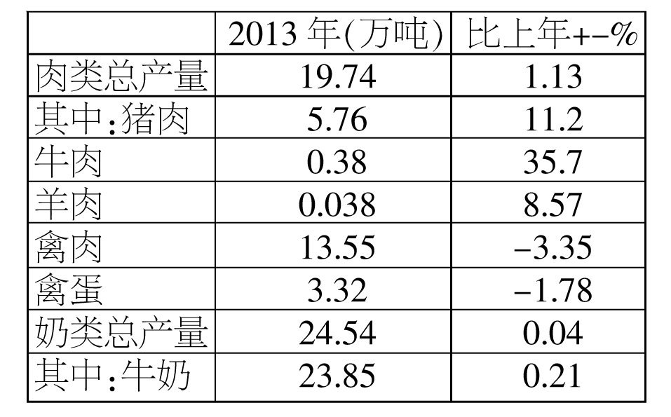 全市畜牧业增加值完成21.5亿元,比上年增长1.94%。大牲畜年末存栏10.8万头,比年初下降1.01%,其中奶牛8.52万头,比年初增长0.12%;生猪年末存栏45.46万头,比年初增长9.23%;家禽出栏8548万只,比上年减少2.45%。肉类总产量19.74万吨,比上年增长1.13%。禽蛋总产量3.32万吨,比上年减少1.78%。奶类总产量24.54万吨,比上年增长0.04%。