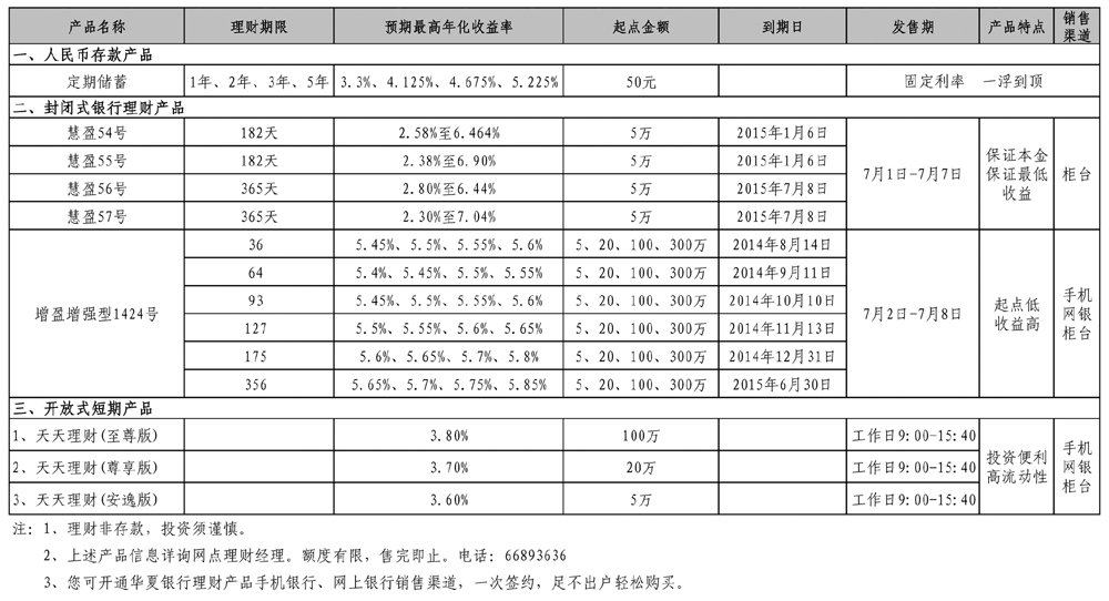 华夏银行提示您:利率不断下调,存款收益降低。为合理优化您个人的资产配置,可适当选择购买理财产品。华夏银行“龙盈”系列理财产品预期收益率全市同业最高,是您投资理财的最佳选择! 咨询电话: 66893636