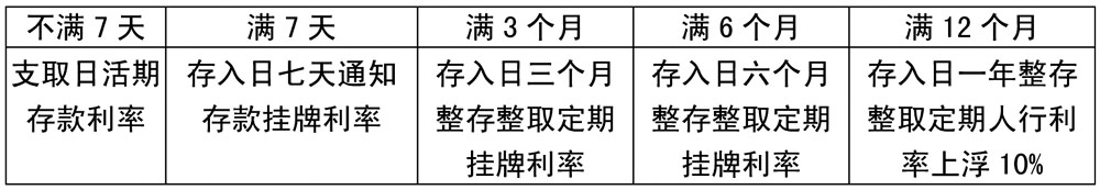 7.到期支取适用利率。到期支取时按开户日人民银行一年期整存整取定期存款基准利率上浮10%。