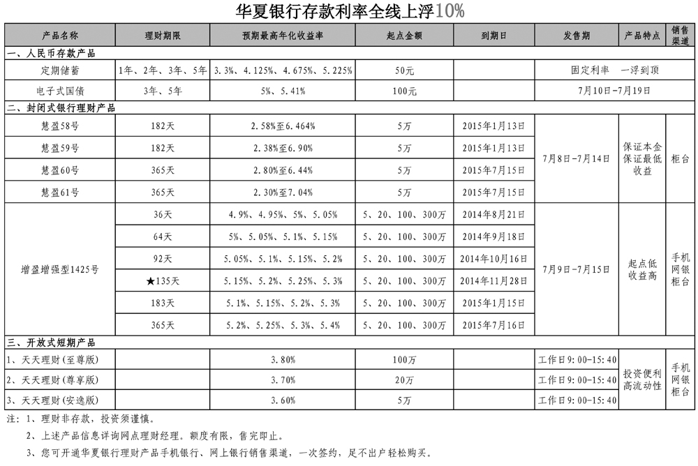 华夏银行提示您:利率不断下调,存款收益降低。为合理优化您个人的资产配置,可适当选择购买理财产品。华夏银行“龙盈”系列理财产品预期收益率全市同业最高,是您投资理财的最佳选择! 咨询电话: 66893636