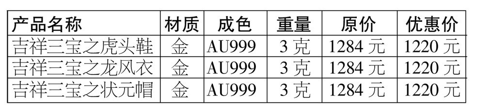 比如“吉祥三宝”守护金,立体的虎头鞋、龙凤衣、状元帽Q萌可爱,极富童真,祝愿宝宝生龙活虎,健康快乐,学业有成;同时小老虎也有辟邪的寓意,能保护宝宝健康快乐的成长;龙风衣寓意龙凤呈祥,背面刻有“富贵荣华”字样,祝愿宝宝未来大富大贵,人生美好,一生好运相伴;状元帽生动精美,寓意金榜题名,祝愿宝宝未来学业有成,功成名就。