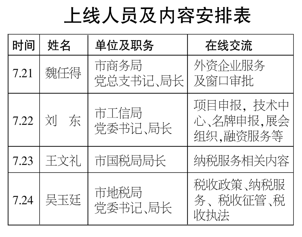 7月21日—7月24日企业服务专题周,每天上午8:50—9:30,市商务局、工信局、国税局、地税局等相关部门领导做客莱西人民广播电台“政风行风在线”栏目,与听众进行在线交流,受理、答复群众投诉。