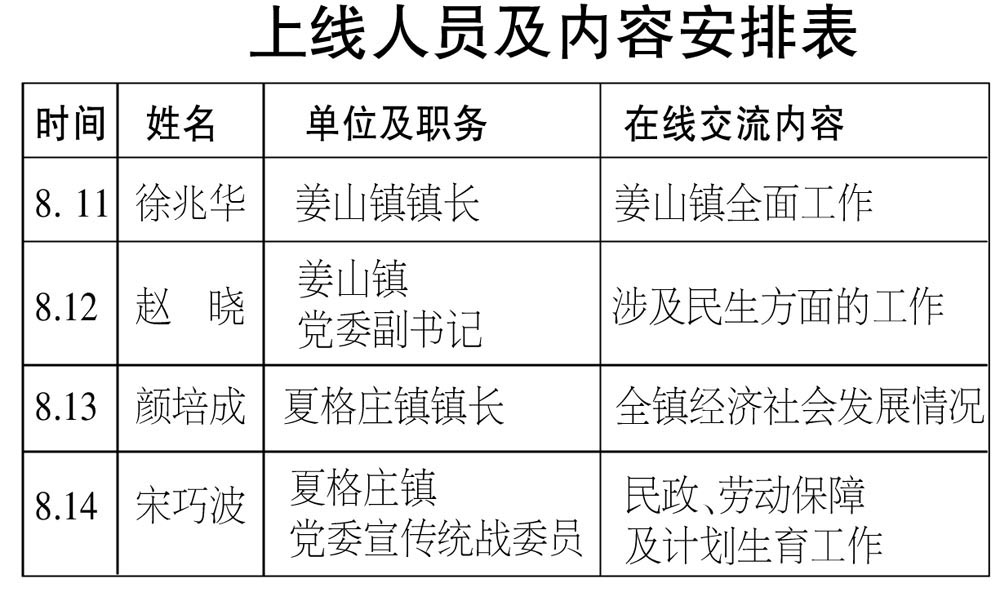 8月11日-8月14日镇街专题周,每天上午8:50—9:30,姜山镇、夏格庄镇相关领导做客莱西人民广播电台“政风行风在线”栏目,与听众进行在线交流,受理、答复群众投诉。