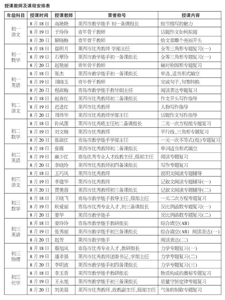 本期共招收11个班,其中初一语文、数学、英语班各一个;初二语文、数学和英语班各一个;初三语文、数学、英语、物理、化学班各一个。上述义教班每班限报50人(按报名先后顺序录取,额满为止)。招生对象为莱西四中本校相应级部有学科辅导需求学生,每人限报一个学科,不得兼报。8月18日~20日共三天时间授课。每天授课时间为上午8:30~10:30;下午3:00~5:00。