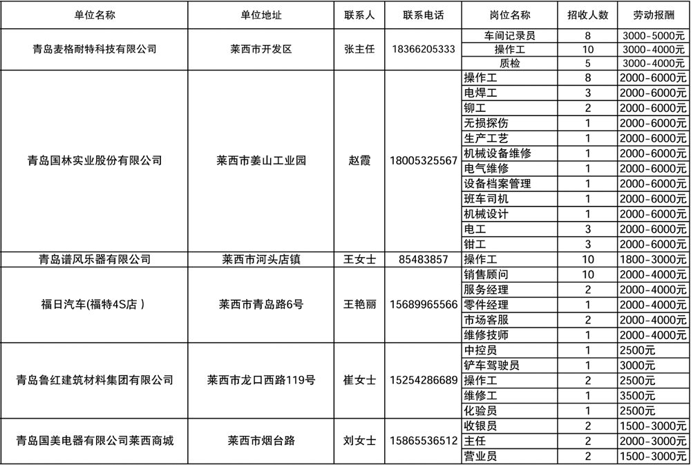 莱西市人力资源市场企业招聘信息