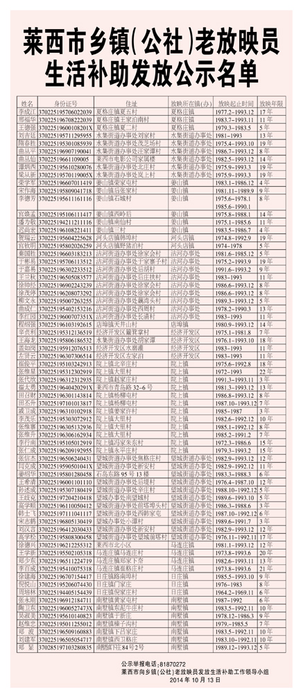 莱西市乡镇(公社)老放映员生活补助发放公示名单