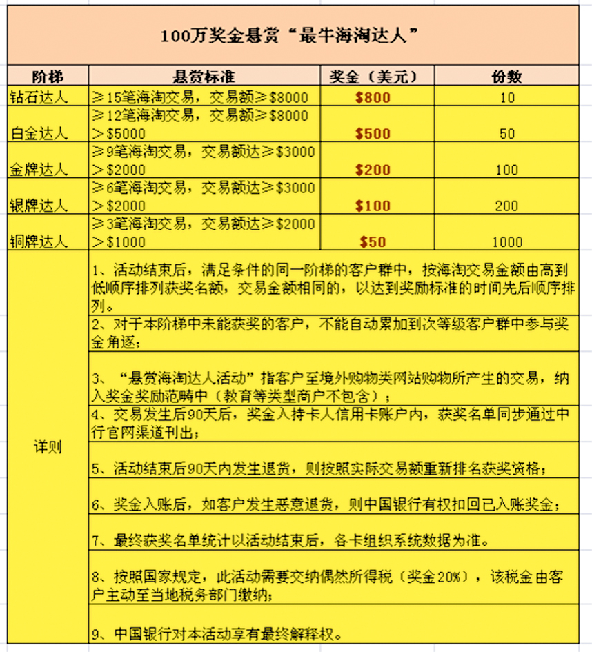 悬赏内容:同一卡组织,达到海淘达人的奖励标准(按交易金额、笔数、时间)的客户,即可获得海淘达人红包,悬赏榜文如下: