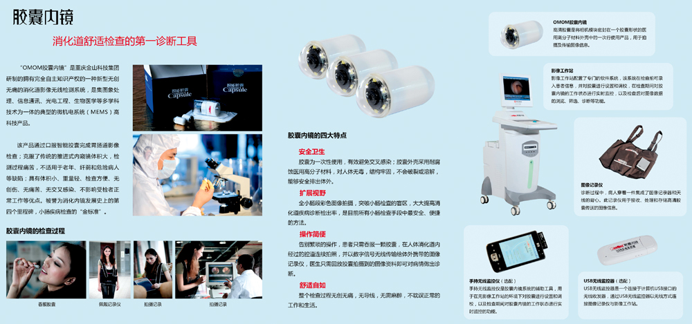 胶囊内镜全称为“智能胶囊消化道内镜系统”,又称“医用无线内镜”。原理是受检者通过口服内置摄像与信号传输装置的智能胶囊,借助消化道蠕动使之在消化道内运动并拍摄图像,医生利用体外的图像记录仪和影像工作站,了解受解受检者的整个消化道情况,从而对其病情做出诊断。胶囊内镜具有检查方便、无创伤、无导线、无痛苦、无交叉感染、不影响患者的正常工作等优点,扩展了消化道检查的视野,克服了传统的插入式内镜所具有的耐受性差、不适用于年老体弱和病情危重等缺陷, 可作为消化道疾病尤其是小肠疾病诊断的首选方法。