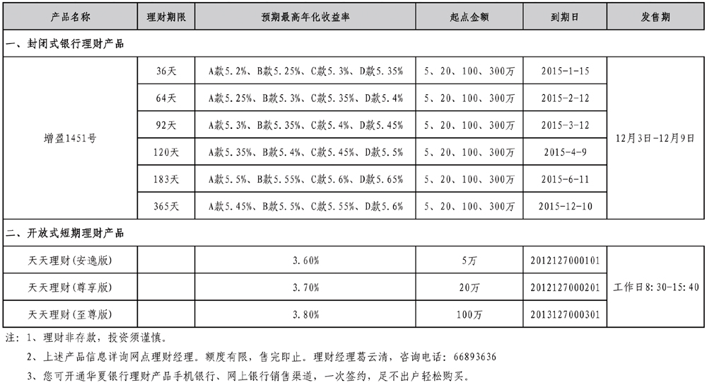 华夏银行提示您:利率不断下调,存款收益降低。为合理优化您个人的资产配置,可适当选择购买理财产品。华夏银行“龙盈”系列理财产品预期收益率全市同业最高,是您投资理财的最佳选择! 咨询电话: 66893636