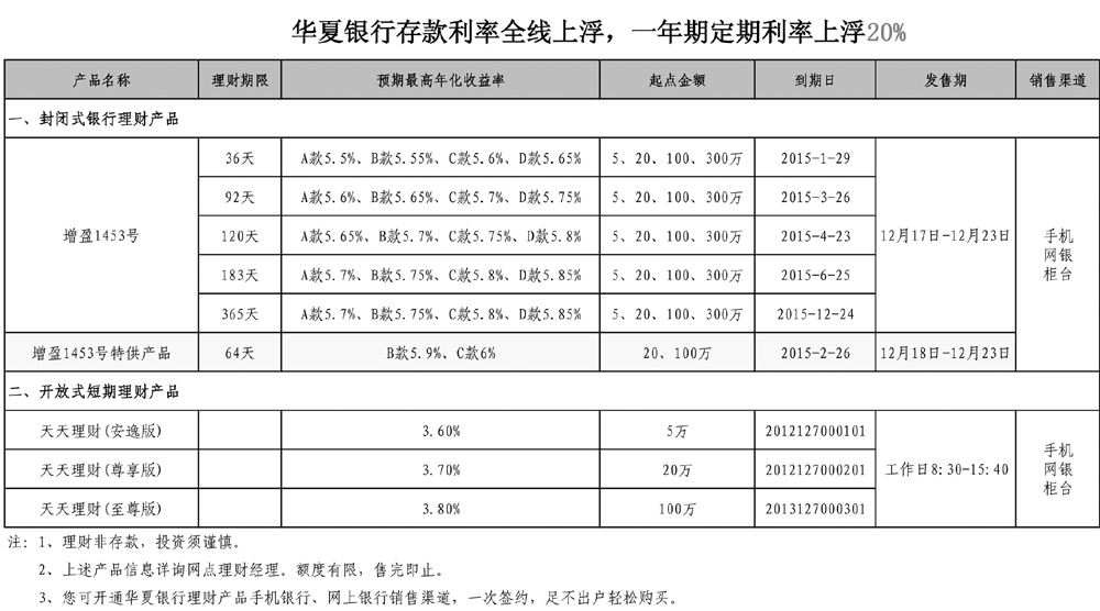 华夏银行提示您:利率不断下调,存款收益降低。为合理优化您个人的资产配置,可适当选择购买理财产品。华夏银行“龙盈”系列理财产品预期收益率全市同业最高,是您投资理财的最佳选择! 咨询电话: 66893636