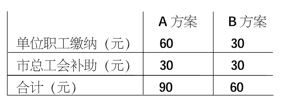 B方案60元,其中参加单位、职工缴纳30元,