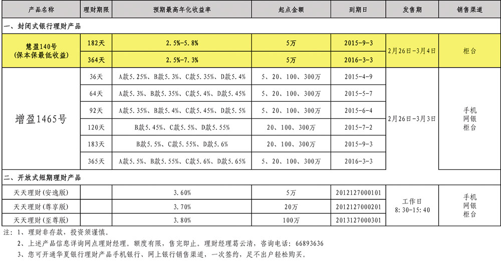华夏银行提示您:利率不断下调,存款收益降低。为合理优化您个人的资产配置,可适当选择购买理财产品。华夏银行“龙盈”系列理财产品预期收益率全市同业最高,是您投资理财的最佳选择!