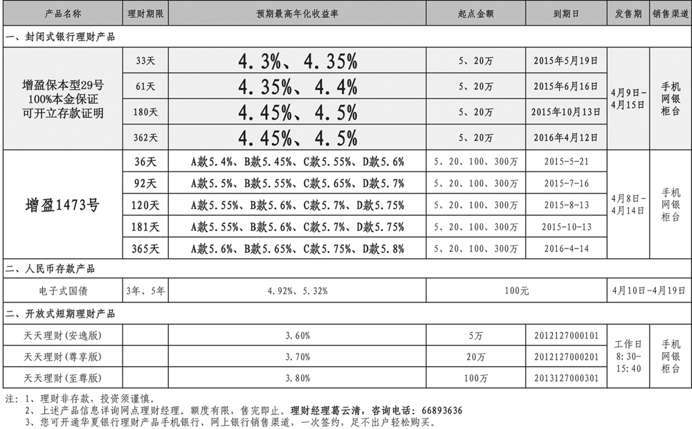 热销理财产品信息2015年4月8日至2015年4月15日
