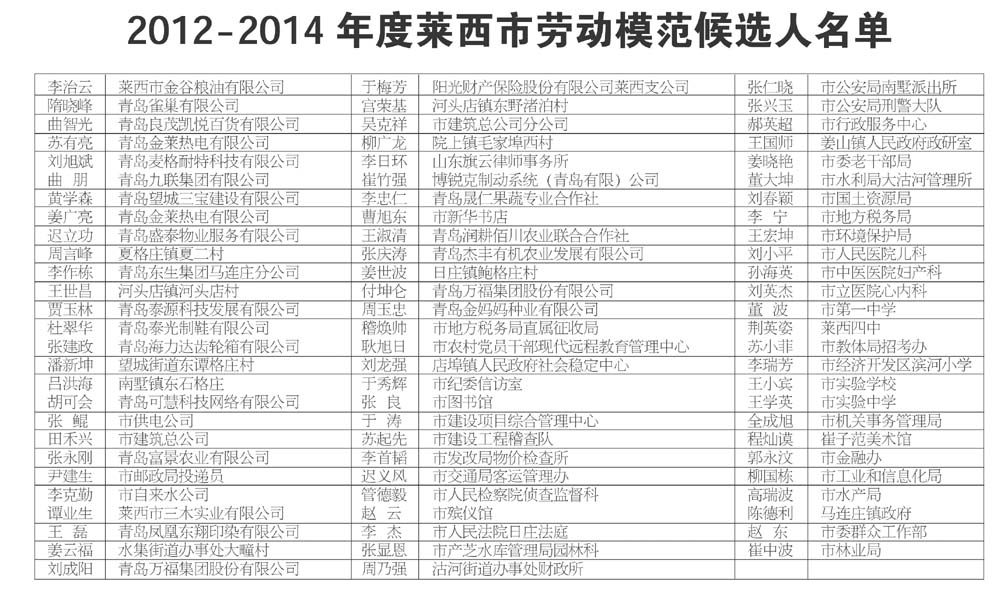 莱西市人民政府决定,今年“五一”节期间命名表彰2012-2014年度莱西市劳动模范。根据评选表彰工作规定,为体现公开、公平、公正原则,广泛听取群众意见,现将莱西市劳动模范人选名单予以公示。如有不同意见,请与2015年4月26日17时前,以电话、传真、电子邮件和信函等形式向莱西市劳模评选表彰筹委会办公室(市总工会宣教部)反映(信函以到达日邮戳为准)。反映问题时,要用真实姓名、单位、联系电话和通讯地址,受理部门将严格保密。