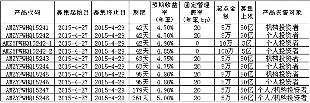 中国银行推出“中银平稳理财计划-智荟系列”产品,发售期为2015年4月27日至4月29日。该系列产品主要投资于银行间市场发行和流通的固定收益类金融工具、银行存款等。产品基本信息如下: