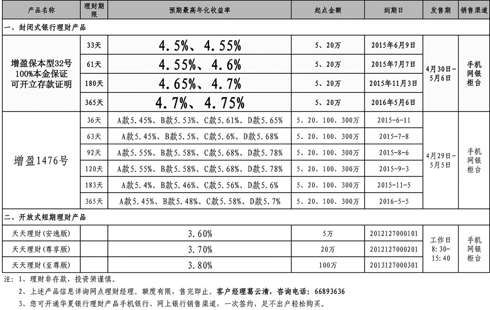 热销理财产品信息2015年4月29日至2015年5月6日